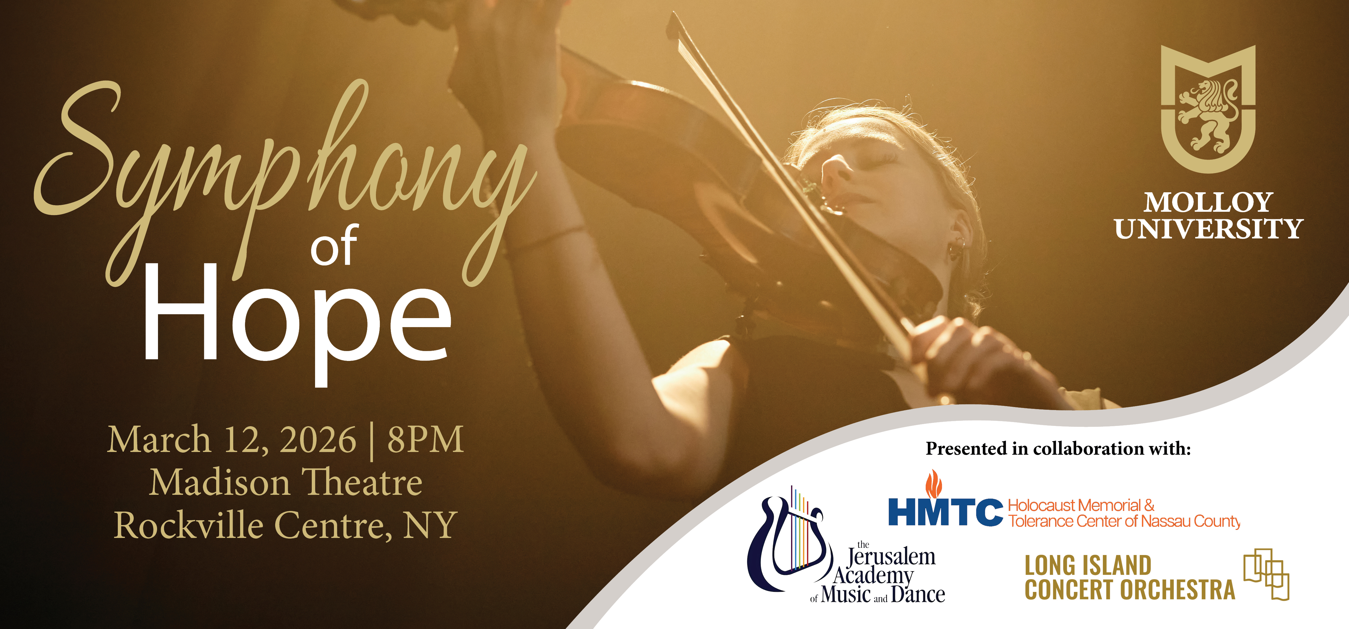 Symphony of Hope will feature Violins of Hope, a collection of restored instruments owned and played by Jewish musicians before and during the Holocaust — some performed in ghettos and concentration camps, others belonging to musicians who did not survive. Paganini Competition winner Simon Zhu will appear as principal soloist, with rising star Jeffrey Dokken conducting. The program also includes a major work by Long Island composer Alexey Shor, joined by a local choir for an evening of reflection, resilience, and hope. This special performance celebrates the power of music to unite people of all faiths and backgrounds.